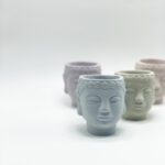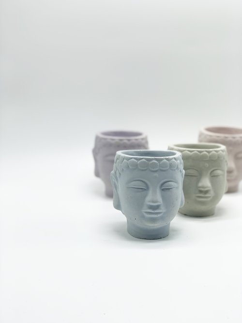 A handmade concrete Buddha Head planter in different color options.